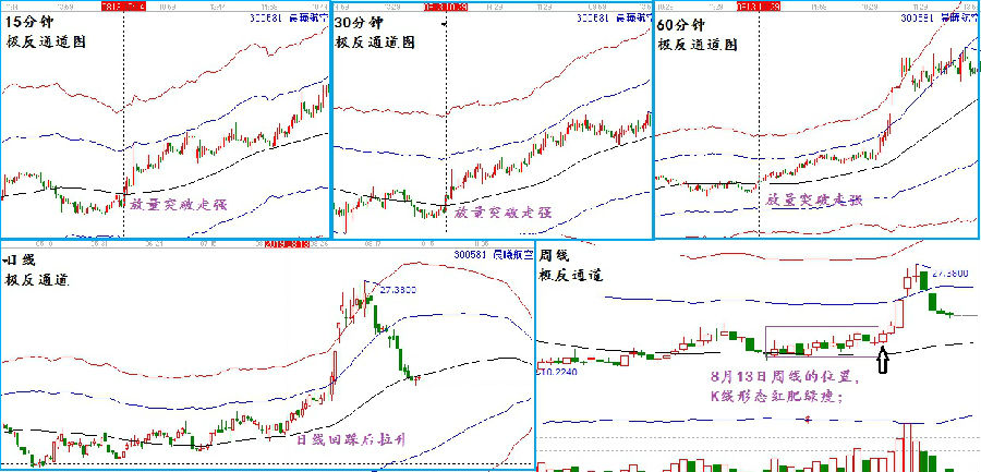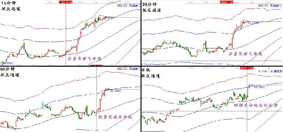 趨勢(shì)共振模型一類(lèi):以極反通道生命線(xiàn)為判斷依據(jù),生命線(xiàn)是判斷市場(chǎng)趨勢(shì)強(qiáng)弱的分界線(xiàn),可以快速直觀的判斷出市場(chǎng)短期,中期,及長(zhǎng)期的趨勢(shì)強(qiáng)弱,如果各周期都是處于強(qiáng)勢(shì)區(qū),這就是一種共振。因此,在實(shí)戰(zhàn)交易中,投資者關(guān)注周線(xiàn),日線(xiàn),60分鐘,30分鐘,及15分鐘,如果這幾個(gè)周期都是處于生命線(xiàn)附近,走勢(shì)協(xié)同,就會(huì)出現(xiàn)短期的快速拉升走勢(shì)。