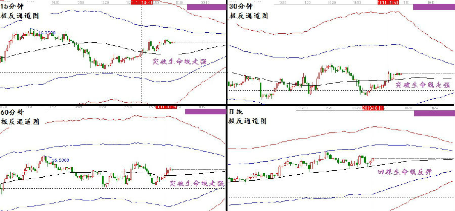 從圖中可以看到10月9日股價(jià)的走勢(shì),其中15分鐘,30分鐘,60分鐘都是放量突破生命線(xiàn),而日線(xiàn)是處于生命線(xiàn)回踩后的反彈階段,其周線(xiàn)圖中我沒(méi)有展示,因?yàn)橹芫€(xiàn)是處于江恩240度關(guān)鍵支撐點(diǎn),并沒(méi)有在生命線(xiàn)附近。