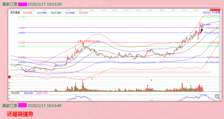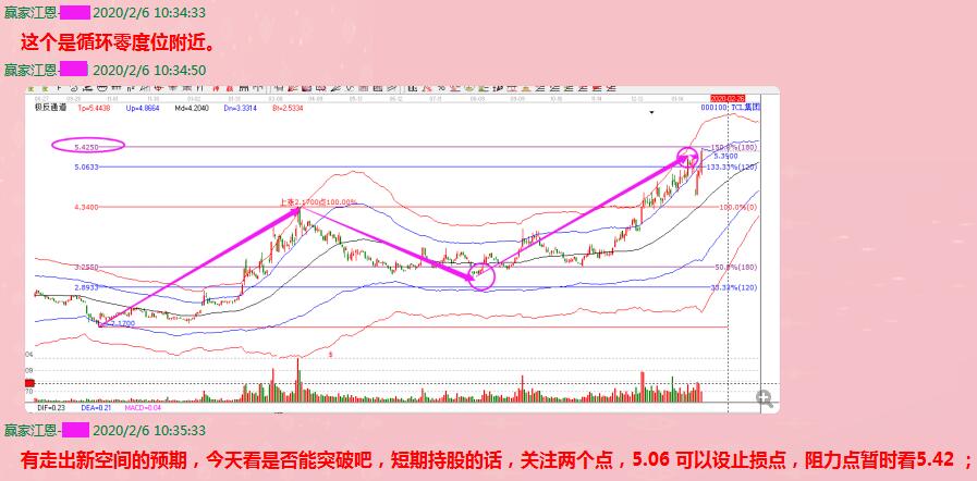 下圖是TCL科技在2月6日的技術分析圖形,具體的作圖方法是,以2018年10月19日的低點和2019年3月25日的高點為起始點,作出江恩波段百分比延伸線(江恩經典價格循環(huán)分析工具之一),保留120度和180度分割(后期調整為135度和180度,更契合市場的歷史走勢)。從圖中可以看到,股價在從最低點2.17起漲后,紅色線見頂回落,并最終在江恩波段百分比120度與180度空間完成止跌,這個分割位是我們在實戰(zhàn)運用中頻繁強調的調整位。止跌之后震蕩上行,并在2019年12月17日突破站上了100%的零度位,此為前期高點,股價在突破后,進入到了新的空間,即100%到133.3%-150%分割區(qū)間,價格波動空間為4.34-5.42。2月6日股價放量上攻,突破了5.06直接挑戰(zhàn)5.42,此時我們要關注的是,該循環(huán)空間是否會打開,股價進入新的空間。其關鍵點就是,價格突破5.42。此位置對應了33.33%-50%區(qū)間。當天最終股價放量漲停突破。