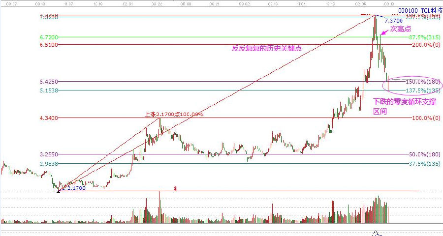 股價的波動很快,但是如何去應對市場的漲跌,漲了是否有賣出的位置,跌了是否有買入的位置,成功的投資者都是逆向的,在普通散戶追入的時候,他們賣出,而在普通散戶割肉的時候,他們進場。TCL科技幾乎可以賣在最高的區(qū)間,而隨后股價反彈形成的次級別高點一樣是可以借助江恩工具來判斷出來的,這是股價向下波動,反抽的關鍵次高點形成位,是江恩波段315度分割點。可以看到,隨后股價便跌破6.51關鍵點,下尋到新的循環(huán)點。
