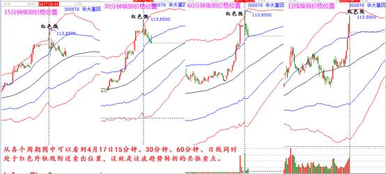 確定了買(mǎi)點(diǎn),那么賣(mài)點(diǎn)在哪里呢?同樣的,按照極反通道的操作規(guī)則,一線站穩(wěn),看高一線。當(dāng)股價(jià)的15分鐘、30分鐘、60分鐘、日線等周期都處于藍(lán)色線,或者紅色外軌線這類(lèi)高概率的賣(mài)出點(diǎn)時(shí),就意味著各個(gè)周期都處于賣(mài)出位置,這就是一個(gè)周期共振的賣(mài)點(diǎn)。我們?cè)倏聪氯A大基因4月17日各個(gè)周期所處的位置。