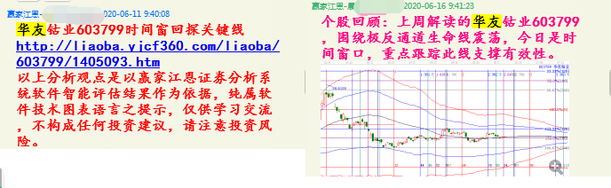 首先大家可以看到華友鈷業(yè)的最初分析,6月11日提前分析出6月16日時間窗 ,另外在6月16日時間窗當(dāng)天也再次提到關(guān)注時間窗的有效性。從圖中可以看到華友鈷業(yè)在2.382倍時間窗口,股價放量拉升,隨后縮量震蕩回落至180度支撐止跌,聊吧11日公開分析的16日的2.618倍時間窗口,當(dāng)天股價站上生命線后,直接拉升至漲停,這就是江恩神奇時間分析的再一次實戰(zhàn)檢驗。