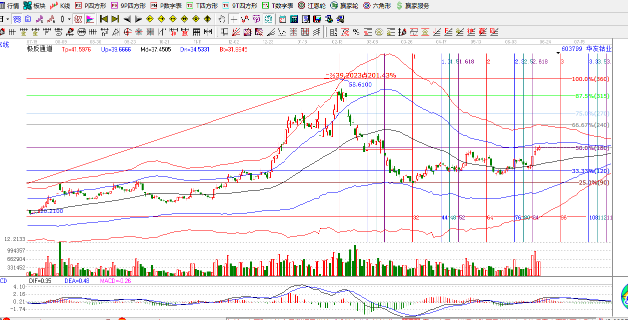 接下來該股如何操作跟進(jìn),大家可以看下華友鈷業(yè)的最新分析圖。6月16日時間窗當(dāng)天和價格共振選擇往上,目前突破180度位置,逼近藍(lán)色上軌線那里 。目前藍(lán)色上軌線壓力價格是40.3元那里,屆時需要關(guān)注壓力的突破情況,下一個時間窗在3倍時間窗7月2日。
