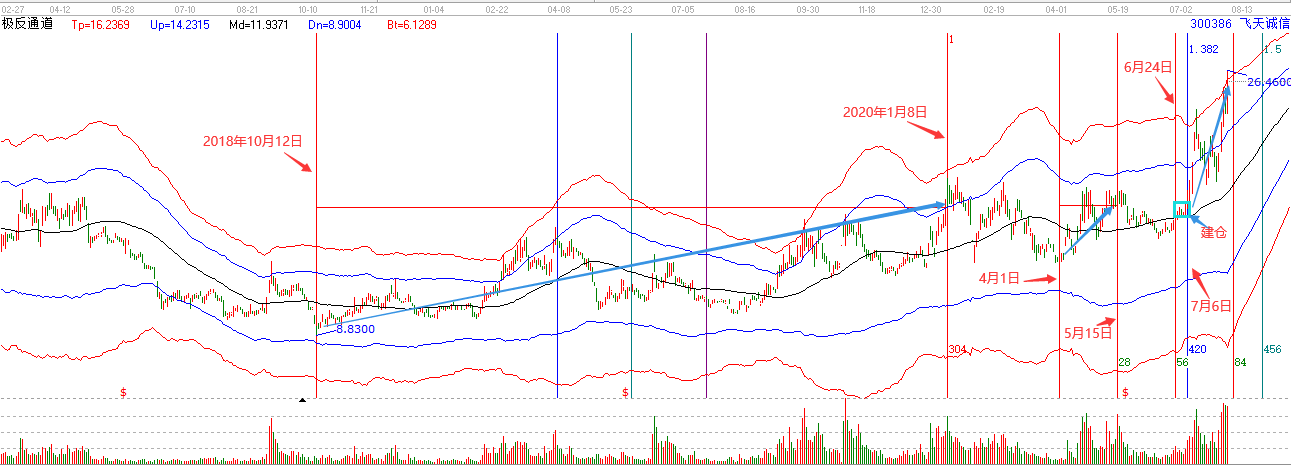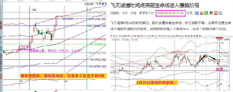 下面我們就通過時間和空間兩個方面來分析飛天誠信的買入點位。首先,我們通過時間分析工具(黃金時間周期線)來對2018年10月12日~2020年1月8日這段走勢進行研究,發(fā)現(xiàn)其在藍色豎線的位置發(fā)生了趨勢變化,那么在未來同樣7月6日藍線的位置會不會變化呢?其走勢證明在藍線的位置,股價開始了快速拉升階段。然后在通過時間分析工具(等距時間周期線)來對2020年4月1日~2020年5月15日這段走勢進行研究,發(fā)現(xiàn)其在6月24日也是一個時間窗口。而在這一天股價站上了極反通道的黑色生命線這個重要支撐位置,隨后幾天在對支撐進行確認之后,在前面提到7月6日藍線的位置開始了快速拉升。