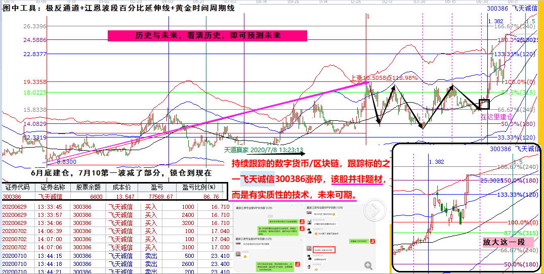 回顧總結(jié)學習該股的選出依據(jù)及操作信號,歷史前一波的上漲作為起始因子,那么未來的走勢江恩時空線幫你提前顯現(xiàn)!遵循江恩所言,精進研究歷史,即可掌控未來!飛天誠信同步6月底建倉,7月10日第一波高點減倉,剩下的鎖倉至今,單只個股利潤逼近8萬元,盈利超80%,這就是波段交易的魅力,你看懂了嗎?