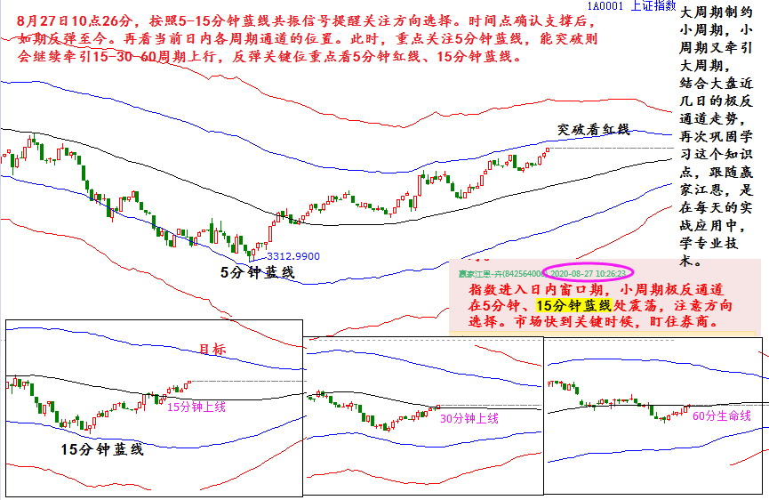 8月27日10點26分,按照5-15分鐘藍(lán)線共振信號提醒關(guān)注方向選擇。時間點確認(rèn)支撐后,如期反彈至今。再看當(dāng)前日內(nèi)各周期通道的位置。此時,重點關(guān)注5分鐘藍(lán)線,能突破則會繼續(xù)牽引15-30-60周期上行,反彈關(guān)鍵位重點看5分鐘紅線、15分鐘藍(lán)線?! ?/p>