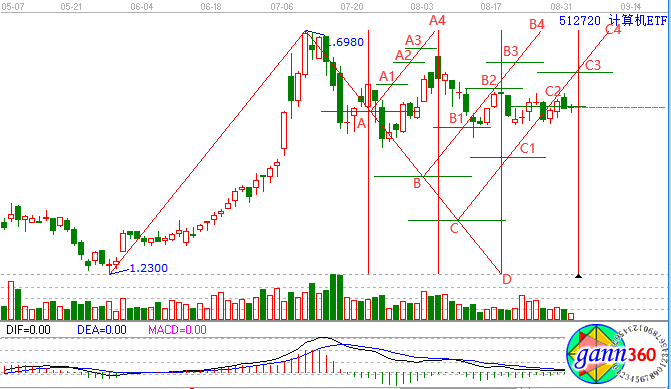 圖中A點(diǎn)所對(duì)應(yīng)的時(shí)間窗口是短期一波上漲的結(jié)束,之后便是下跌,A4點(diǎn)和D點(diǎn)所對(duì)應(yīng)的時(shí)間窗口同樣也是上漲的結(jié)束,之后出現(xiàn)下跌。那么計(jì)算機(jī)ETF接下來(lái)怎么走呢?