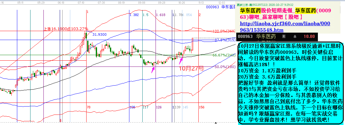10月27日依據(jù)贏家江恩系統(tǒng)極反通道+江恩時(shí)間解讀的華東醫(yī)藥000963,時(shí)價(jià)關(guān)鍵位啟動(dòng),今日放量突破藍(lán)色上軌線漲停,目前累計(jì)漲幅高達(dá)18%!
