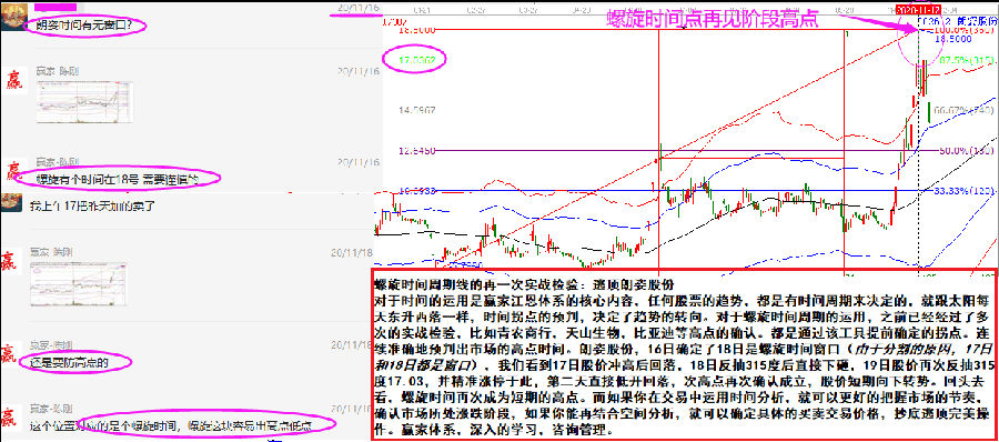 對(duì)于時(shí)間的運(yùn)用是贏家江恩體系的核心內(nèi)容,任何股票的趨勢(shì),都是有時(shí)間周期來決定的,就跟太陽每天東升西落一樣, 時(shí)間拐點(diǎn)的預(yù)判,決定了趨勢(shì)的轉(zhuǎn)向。對(duì)于螺旋時(shí)間周期的運(yùn)用,之前已經(jīng)經(jīng)過了多次的實(shí)戰(zhàn)檢驗(yàn),比如青農(nóng)商行,天山生物,比亞迪等高點(diǎn)的確認(rèn)都是通過該工具提前確定的拐點(diǎn)。連續(xù)準(zhǔn)確地預(yù)判出市場(chǎng)的高點(diǎn)時(shí)間。朗姿股份,16日確定了18日是螺旋時(shí)間窗口( 由于分割的原因,17日和18日都是窗口),我們看到17日股價(jià)沖高后回落,18日反抽315度后直接下砸,19日股價(jià)再次反抽315度17.03,并精準(zhǔn)漲停于此,第二天直接低開回落,次高點(diǎn)再次確認(rèn)成立,股價(jià)短期向下轉(zhuǎn)勢(shì)?;仡^去看,螺旋時(shí)間再次成為短期的高點(diǎn)。而如果你在交易中運(yùn)用時(shí)間分析,就可以更好的把握市場(chǎng)的節(jié)奏,確認(rèn)市場(chǎng)所處漲跌階段;如果你能再結(jié)合空間分析,就可以確定具體的買賣交易價(jià)格,抄底逃頂完美操作。