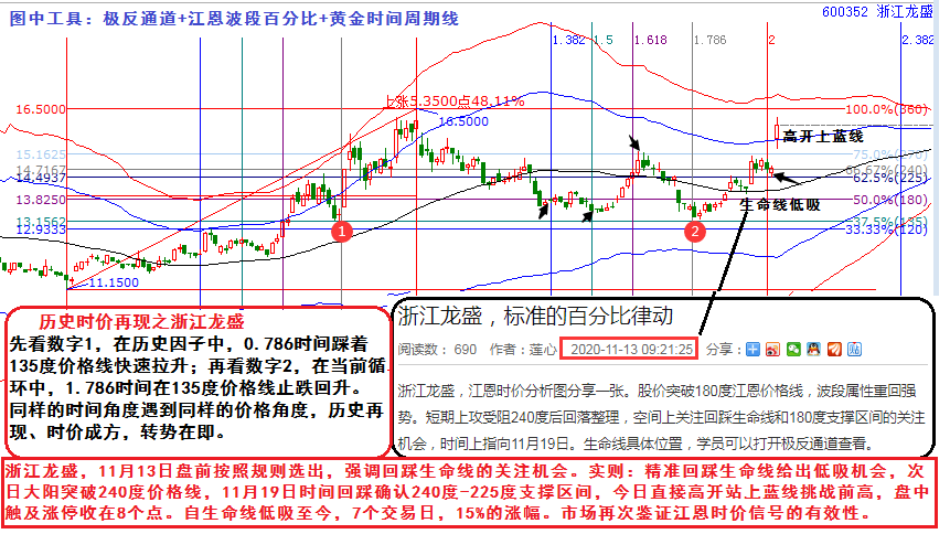 浙江龍盛,11月13日盤前按照規(guī)則選出,強(qiáng)調(diào)回踩生命線的關(guān)注機(jī)會(huì)。實(shí)則:精準(zhǔn)回踩生命線給出低吸機(jī)會(huì),次日大陽突破240度價(jià)格線,11月19日時(shí)間回踩確認(rèn)240度-225度支撐區(qū)間,今日直接高開站上藍(lán)線挑戰(zhàn)前高,盤中觸及漲停收在8個(gè)點(diǎn)。自生命線低吸至今,7個(gè)交易日,15%的漲幅。市場(chǎng)再次鑒證江恩時(shí)價(jià)信號(hào)的有效性。