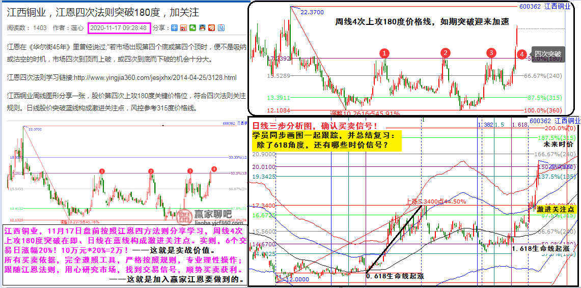 江西銅業(yè),11月17日盤前按照江恩四方法則分享學(xué)習(xí),周線4次上攻180度突破在即、日線在藍(lán)線構(gòu)成激進(jìn)關(guān)注點(diǎn)。實(shí)則,6個(gè)交易日漲幅20%!10萬元*20%=2萬!這就是實(shí)戰(zhàn)價(jià)值。