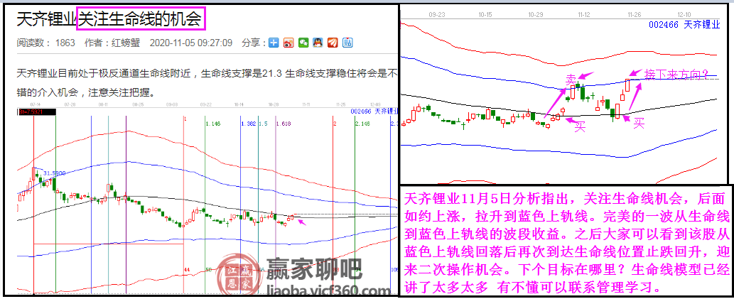 天齊鋰業(yè)11月5日分析指出,關(guān)注生命線機(jī)會(huì),后面如約上漲,拉升到藍(lán)色上軌線。完美的一波從生命線到藍(lán)色上軌線的波段收益。之后大家可以看到該股從藍(lán)色上軌線回落后再次到達(dá)生命線位置止跌回升,迎來二次操作機(jī)會(huì)。下個(gè)目標(biāo)在哪里?生命線模型已經(jīng)講了太多太多 有不懂可以聯(lián)系管理學(xué)習(xí)。