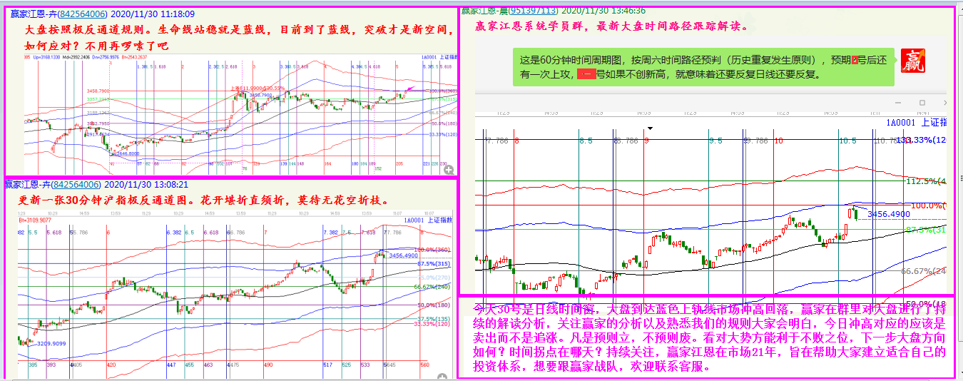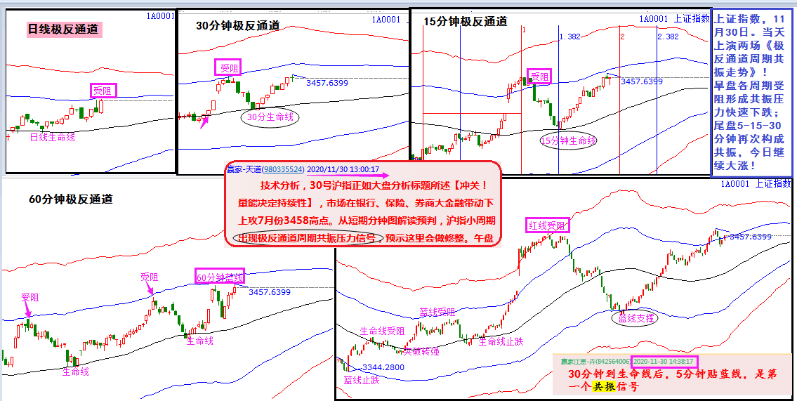 對(duì)照上證指數(shù)日線(xiàn)及日內(nèi)各周期的極反通道匯總圖,11月30日早盤(pán)強(qiáng)勢(shì)上攻,各周期全部受阻形成共振賣(mài)點(diǎn)——快速下跌;尾盤(pán)指數(shù)5-15-30分鐘均回落到支撐線(xiàn)構(gòu)成共振低吸信號(hào),實(shí)則,今日大陽(yáng)報(bào)收!連續(xù)兩場(chǎng)《極反通道周期共振信號(hào)的標(biāo)準(zhǔn)走勢(shì)》,感受到市場(chǎng)的神奇魅力了嗎?