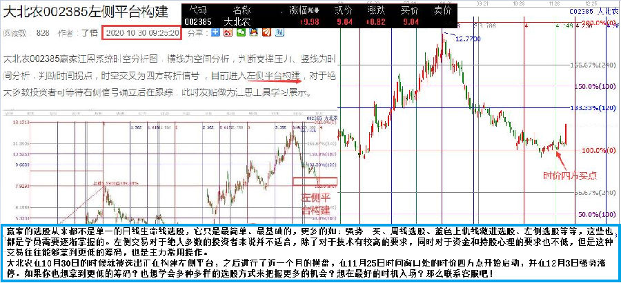 大北農(nóng)在10月30日的時(shí)候就被選出正在構(gòu)建左側(cè)平臺(tái),之后進(jìn)行了近一個(gè)月的橫盤(pán),在11月25日時(shí)間窗口處的時(shí)價(jià)四方點(diǎn)開(kāi)始啟動(dòng),并在12月3日強(qiáng)勢(shì)漲停。