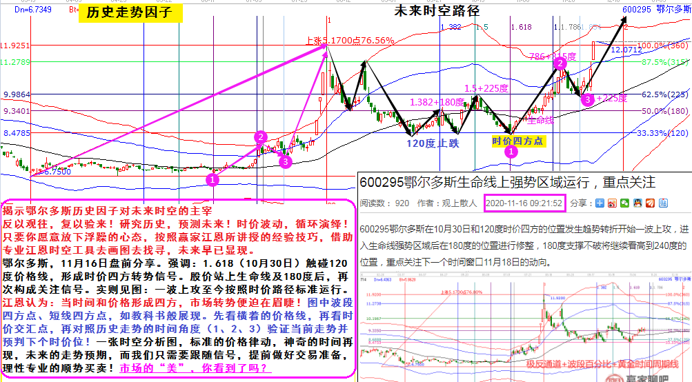 鄂爾多斯,11月16日盤前分享。強調:1.618(10月30日)觸碰120度價格線,形成時價四方轉勢信號。股價站上生命線及180度后,再次構成關注信號。實則見圖:一波上攻至今按照時價路徑標準運行。
