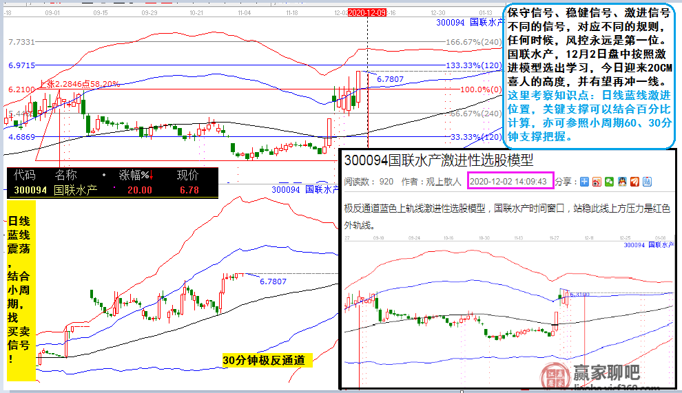 國聯水產,12月2日盤中按照激進模型選出學習,今日迎來20CM喜人的高度,并有望再沖一線。這里考察知識點:日線藍線激進位置,關鍵支撐可以結合百分比計算,亦可參照小周期60、30分鐘支撐把握。保守信號、穩(wěn)健信號、激進信號。不同的交易信號,對應不同的規(guī)則,任何時候,風控永遠是第一位。