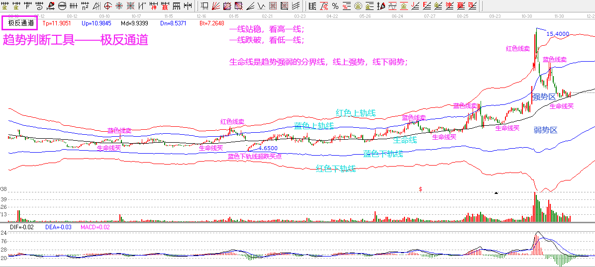 極反通道是在道家物極必反思想的基礎上,融合江恩的經典分割理論,用5條線直觀清晰的展現市場當下的趨勢以及價格的波動空間。具體判斷方法如下:1.判斷趨勢——極反通道中間的黑色線,稱為生命線。依據股價與生命線的關系:股價在生命線以上,則股票強勢可以操作;股價在生命線以下,則股票弱勢暫不考慮。生命線是一個強勢股票的啟動點,所以贏家建議優(yōu)先考慮生命線附近的股票,有強勢股不做弱勢股。2漲跌空間預判——5條線互為支撐和壓力:一線站穩(wěn)看高一線,一線受阻(跌破)回調一線。記住:線上支撐,線下壓力。當前股價在線上則為支撐,站穩(wěn)上漲目標看高一線;當前股價在線下則為壓力,上不去回調空間看低一線。3.買賣點確定——支撐站穩(wěn)即是買點,壓力過不去則是賣點。