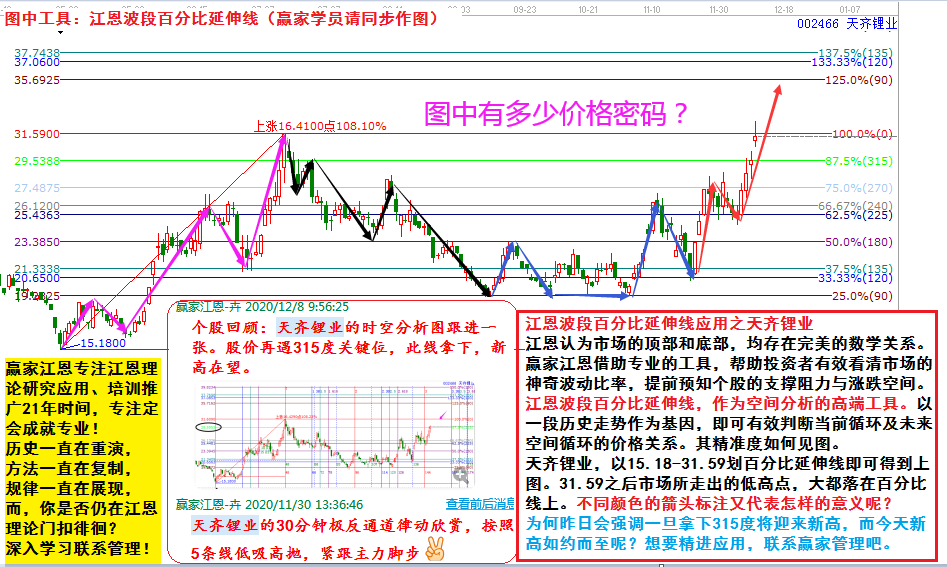 江恩認為市場的頂部和底部,均存在完美的數學關系。贏家江恩借助專業(yè)的工具,幫助投資者有效看清市場的神奇波動比率,提前預知個股的支撐阻力與漲跌空間。江恩波段百分比延伸線,作為空間分析的高端工具。以一段歷史走勢作為基因,即可有效判斷當前循環(huán)及未來空間循環(huán)的價格關系。其精準度如何見圖。天齊鋰業(yè),以15.18-31.59劃百分比延伸線即可得到上圖。31.59之后市場所走出的低高點,大都落在百分比線上。