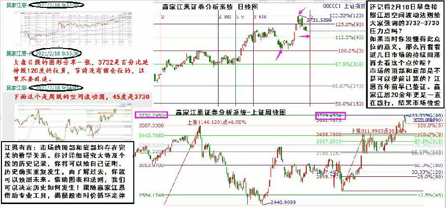 江恩有言:市場的頂部和底部均存在完美的數(shù)學(xué)關(guān)系。經(jīng)過詳細研究大勢及個股的歷史記錄,你將可以給自己證明,歷史確實重復(fù)發(fā)生,而了解過去,你就可以預(yù)測未來。借助圖表和法則,我們可以決定歷史如何發(fā)生!跟隨贏家江恩借助專業(yè)工具,揭秘股市時價循環(huán)定律! 還記得2月18日早盤按照江恩空間波動法則給大家強調(diào)的3732-3730壓力點嗎?如果當(dāng)時你沒懂得此點位的意義,那么再看看近幾日市場的持續(xù)回落再去看這個點位呢?市場的頂部和底部是不是可以提前計算的?江恩百年前早已鑒證。贏家江恩20余年更是一直在踐行,結(jié)果市場檢驗。