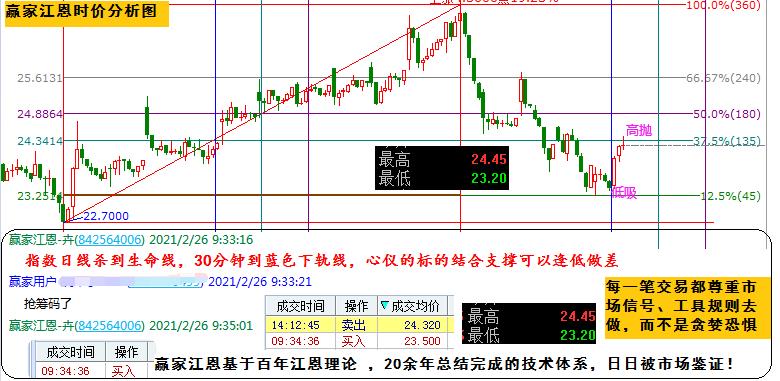 今日差價任務(wù)完成,小5個點的利潤落袋。對照圖形去看,早盤指數(shù)直接探至日線生命線、30分鐘藍線構(gòu)成左側(cè)關(guān)注信號,按照時價信號低吸博差價,如期抵達阻力高拋離場。而再看預(yù)期的支撐23.25,阻力24.34;實際日內(nèi)最低23.2,最高24.45,誤差0.05-0.1,在23.5低吸,24.32高拋,近1元的利潤不算多,但是日積月累呢?如果你也可以看清股價的波動空間,好股可以做的更好;被套亦可通過差價早日解套。技術(shù)決定利潤,贏家江恩基于百年江恩理論總結(jié)得出的技術(shù)體系,日日被市場驗證。在市場里的每一筆交易,都是尊重市場信號,按照工具規(guī)則去做,絕不是貪婪恐懼。