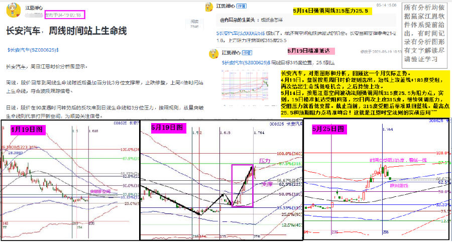 5月14日,按照江恩空間波動(dòng)法則強(qiáng)調(diào)周線315度25.5為阻力點(diǎn),實(shí)則,19日精準(zhǔn)抵達(dá)受阻回落,22日再次上攻至315度,繼續(xù)強(qiáng)調(diào)壓力,受阻壓力就看低支撐。截至當(dāng)前,315度受阻后標(biāo)準(zhǔn)跌回藍(lán)線。最高點(diǎn)25.5和預(yù)期阻力點(diǎn)精準(zhǔn)吻合!這就是江恩時(shí)空法則的實(shí)戰(zhàn)應(yīng)用。
