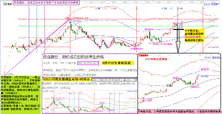 百亞股份,3月29日選出,一波上攻到藍(lán)線(15%有之),受阻跌回生命線;4月29日再次強(qiáng)調(diào)關(guān)注,再來(lái)一波到藍(lán)線(30%有之)。藍(lán)線受阻震蕩,按照60分鐘低吸高拋(10%有之)。對(duì)照?qǐng)D形仔細(xì)揣摩交易信號(hào),能嚴(yán)格按照技術(shù)信號(hào)操作,兩波上攻50%的利潤(rùn)有之。江恩視角+專業(yè)工具+技術(shù)模型+實(shí)戰(zhàn)規(guī)則=理性獲利。