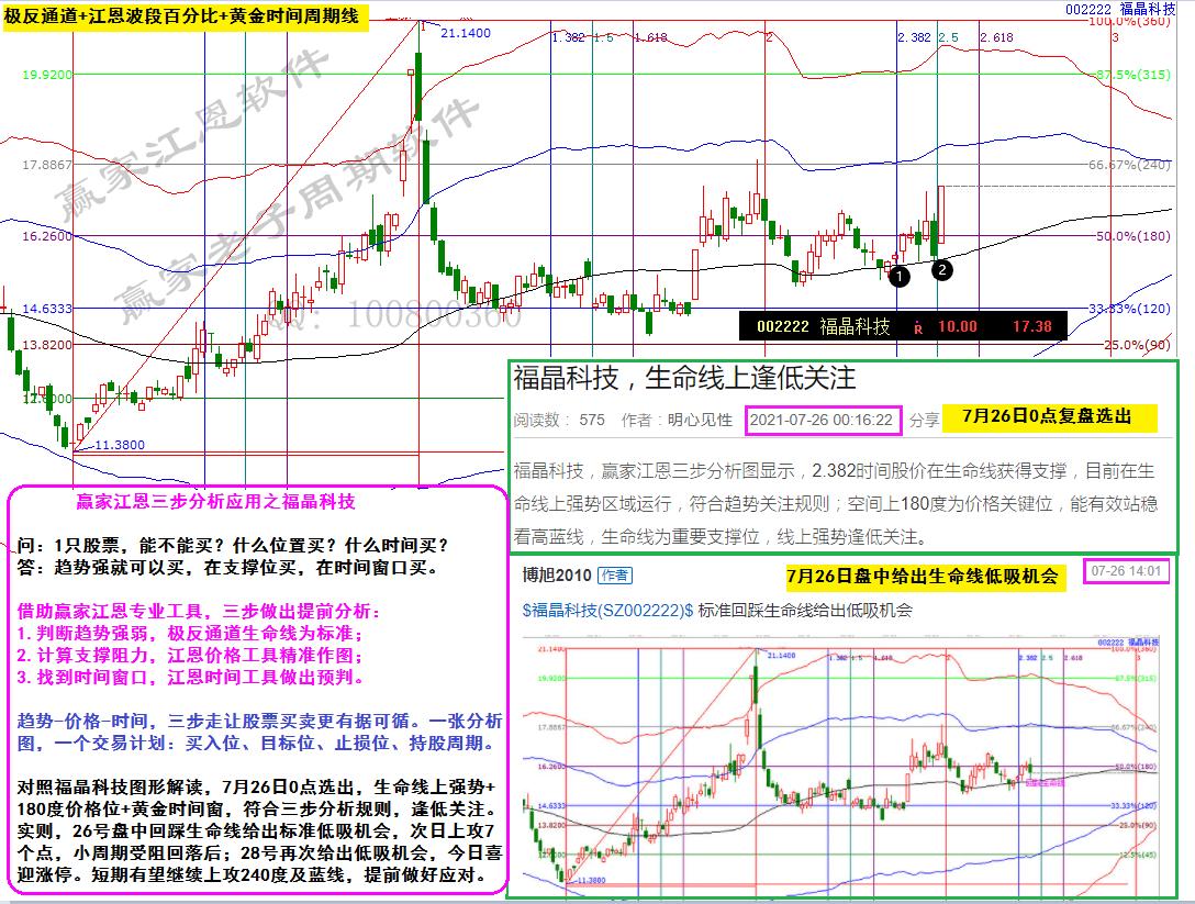 對(duì)照福晶科技圖形解讀,7月26日0點(diǎn)選出,生命線上強(qiáng)勢(shì)+180度價(jià)格位+黃金時(shí)間窗,符合三步分析規(guī)則,逢低關(guān)注。實(shí)則,26號(hào)盤中回踩生命線給出標(biāo)準(zhǔn)低吸機(jī)會(huì),次日上攻7個(gè)點(diǎn),小周期受阻回落后;28號(hào)再次給出低吸機(jī)會(huì),今日喜迎漲停。短期有望繼續(xù)上攻240度及藍(lán)線,提前做好應(yīng)對(duì)。