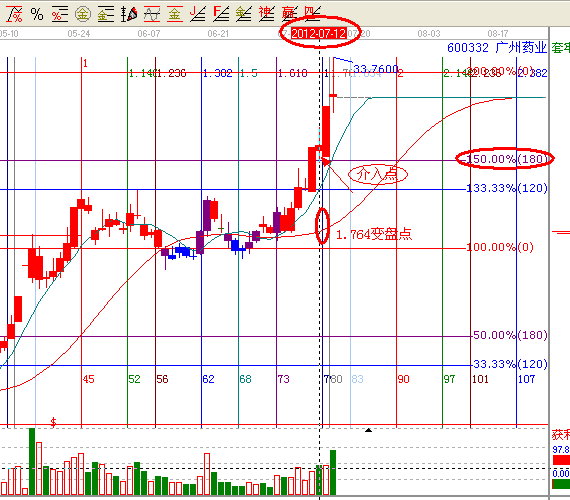 第二:依據(jù)贏家江恩分析系統(tǒng)時(shí)間工具,黃金時(shí)間周期線(xiàn),提示此票7月12日,是黃金時(shí)間周期線(xiàn)的第二個(gè)循環(huán)的1.764的時(shí)間變盤(pán)點(diǎn),(黃金時(shí)間周期線(xiàn)作圖,起點(diǎn)為2011年10月24日,終點(diǎn)2012年5月24日的連線(xiàn))如下圖