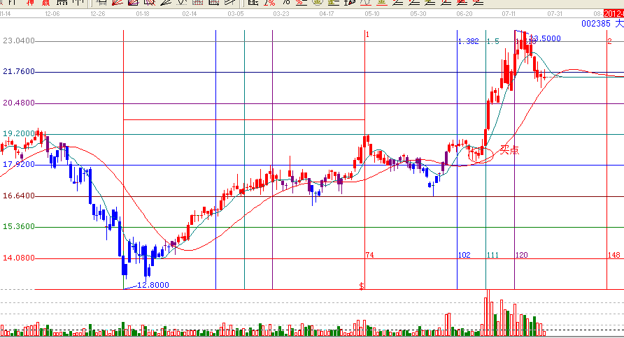 第一:依據(jù)贏家江恩分析系統(tǒng)趨勢(shì)工具乾坤k線顯示:002385,此票在6月29日放量突破乾坤k線綠色關(guān)注線,(依據(jù)贏家乾坤k線操作規(guī)則,k線上穿關(guān)注線可關(guān)注介入)
