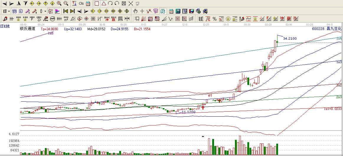 600228昌九生化在角度線1*1線位置2012-12-14日11.12止跌上行,連續(xù)的小陽線線 直到到2012-12-19日漲停極反通道上行才開始了黑馬之旅,底部構成也可以算是10全10美。只有一跟小陰線,可以忽略不計。 一旦突破極反通道生命線,特別是漲停方式突破極反通道生命線,那就是短期進入了強勢區(qū)域,贏家極反通道可以告訴我們:生命線上強勢走,生命線下難抬頭,牛股都是在生命線上方運行的。每一次的運動后期都是按照角度線運行的,每一次的高點低點加倉位置都逃脫不了角度線的區(qū)域。