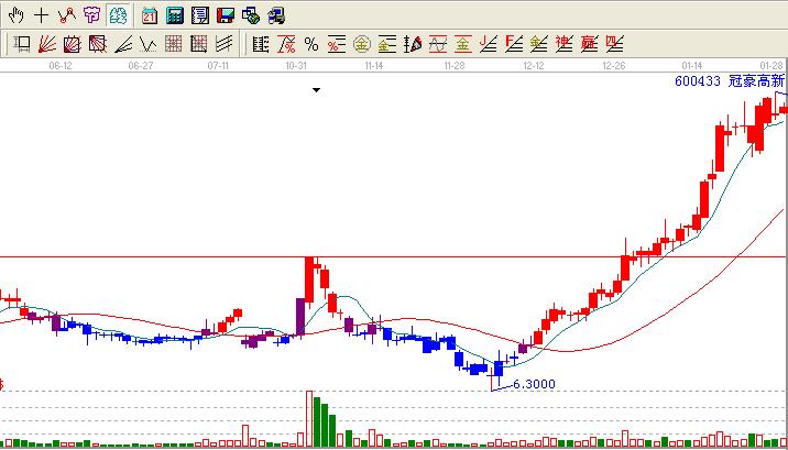 反觀歷史我們會(huì)發(fā)現(xiàn)蛛絲馬跡:600433在2012-11-01日放量后9.00一路跌倒6.30位置然后開始了10連陽。這個(gè)也有人叫做十全十美,一般會(huì)走出一波行情,那么600433在走出十全十美之后一直是馬不停蹄緩緩上行,在其2012-12-27日很小的量過了9.00附近的高點(diǎn)創(chuàng)出了歷史新高,這個(gè)位置沒有停留多久就再一次新高基本是3天5天一個(gè)新高也不理會(huì)大盤,就那樣一直橫行無阻的新高著。很多人都發(fā)現(xiàn)了這個(gè)股票不錯(cuò),但是都是啃一口就走掉了,就這樣一直看著他新高。江恩的話在這個(gè)案例中再一次發(fā)揮的淋漓盡致。也充分的說明了江恩理論在其實(shí)戰(zhàn)中的一個(gè)地位,就看你是如何理會(huì)江恩理論了。