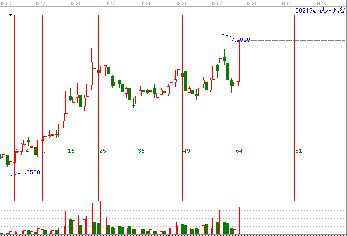 *:平方時間周期線:依據(jù)贏家平方時間周期線提示002194的變盤點在3月14日(也就是64周天的變盤日),(這個工具的用法選擇重要的高低點即可,002194的時間起點為12年12月04日的低點。)