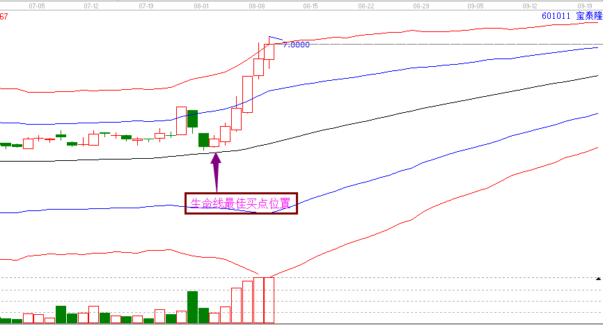 2.圖形解析:在極反通道操作規(guī)則中,生命線是強勢和弱勢的區(qū)分線。處于極反通道生命線上,則為強勢;反之,處于生命線下則為弱勢。而在強勢區(qū)域的個股,買點位置在每一條線的支撐位附近。即生命線支撐位的位置以及藍色上軌線支撐的位置。寶泰隆在8月1日回踩極反通道生命線位置,形成了生命線最佳的買點位置。因此在8月1日回踩生命線的時候開始操作。