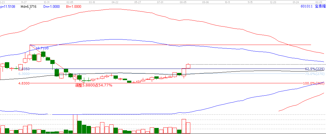 但在日線周期中,短時間需要關(guān)注價格百分比66.67%的阻力位,即8.05。