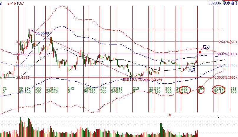 4.后期策略:目前市場已經(jīng)從生命線上漲到了藍(lán)色線附近,從上面的分析圖中也可以看到,8月24日時間窗口漲停在藍(lán)色線附近,后期關(guān)注藍(lán)色線是否可以站穩(wěn),如果站穩(wěn),則仍然可以操作,不過上方的價格壓力180度也是需要注意,如果不能突破站上,謹(jǐn)慎做多。當(dāng)然,如果市場回落,則可注意生命線附近的買點,其下個時間點在9月19日前后。