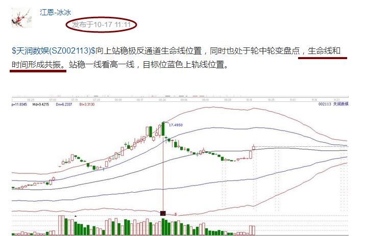 江恩分析圖形:依據(jù)贏家江恩極反通道操作規(guī)則,當(dāng)個(gè)股處于極反通道生命線上,則個(gè)股處于可操作區(qū)域,當(dāng)個(gè)股處于生命線下,則暫時(shí)放棄。通常情況下,當(dāng)個(gè)股向上突破極反通道生命線位置,則生命線附近就是最佳的買點(diǎn)位置。天潤(rùn)數(shù)娛在10月17日向上突破極反通道生命線位置,突破生命線開啟新的一輪行情,因此我們?cè)?7日選出該股。