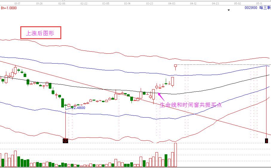 時(shí)間和極反通道生命線二者共振,就產(chǎn)生了我們的27號買點(diǎn),因此在27號選出。然后按照極反通道操作規(guī)則,站穩(wěn)一線看高一線,生命線操作了,第一個(gè)目標(biāo)位就是藍(lán)色上軌線位置,一旦突破了藍(lán)色上軌線位置,則第二個(gè)目標(biāo)位就是紅色上軌線位置,從時(shí)間上看,未來需要關(guān)注的時(shí)間窗在11號、12號。個(gè)股再持續(xù)拉升,在下一個(gè)時(shí)間窗就可能形成高點(diǎn)了,也就是最終的賣出位置。不管是操作前的提前預(yù)測分析,還是操作之后對未來賣出的預(yù)測判斷,依據(jù)這套系統(tǒng)都可以完美的解決。系統(tǒng)形成,賺錢當(dāng)然更容易。