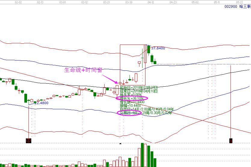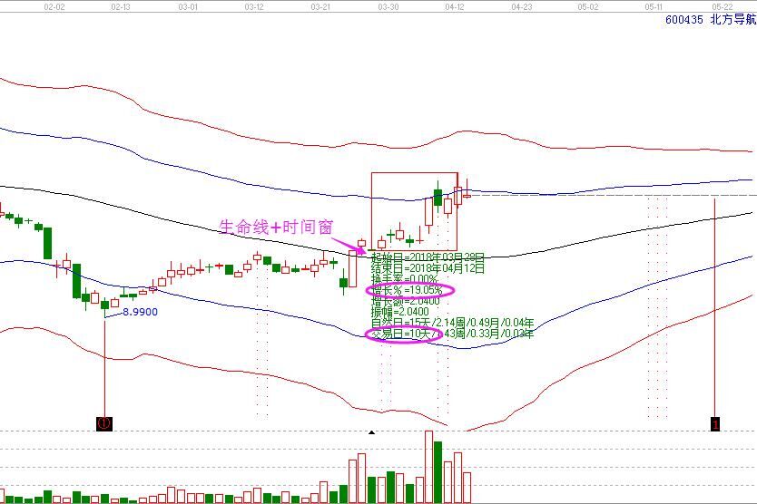 生命線和時(shí)間窗共振的位置啟動(dòng),上藍(lán)色上軌線位置,再到紅色上軌線位置,之后從紅色上軌線開(kāi)始回落,走出一波完整的上漲波段。3月27日至4月10日高點(diǎn),共9個(gè)交易日,漲幅空間近40%,生命線+時(shí)間窗盈利模型完美驗(yàn)證。