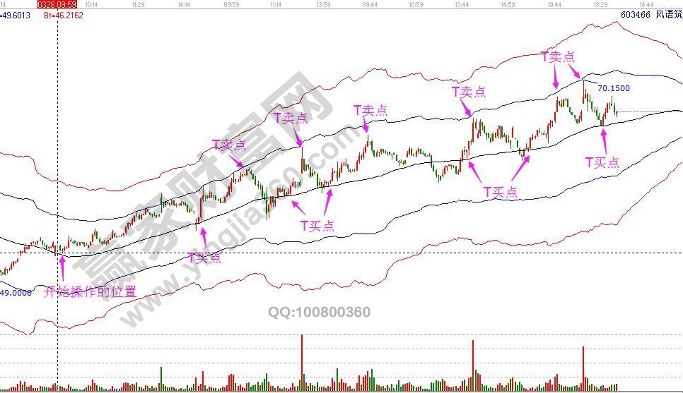 日內(nèi)做T一般看小周期走勢進(jìn)行交易,通常情況下,贏家江恩做差價結(jié)合15分鐘周期和5分鐘來做,能把握到日內(nèi)小的波動,按照極反通道操作規(guī)則,依然是生命線位置最佳買點,藍(lán)色上軌線、紅色上軌線為賣點。