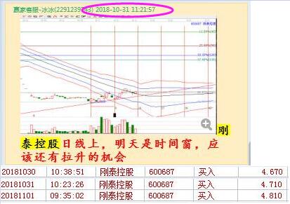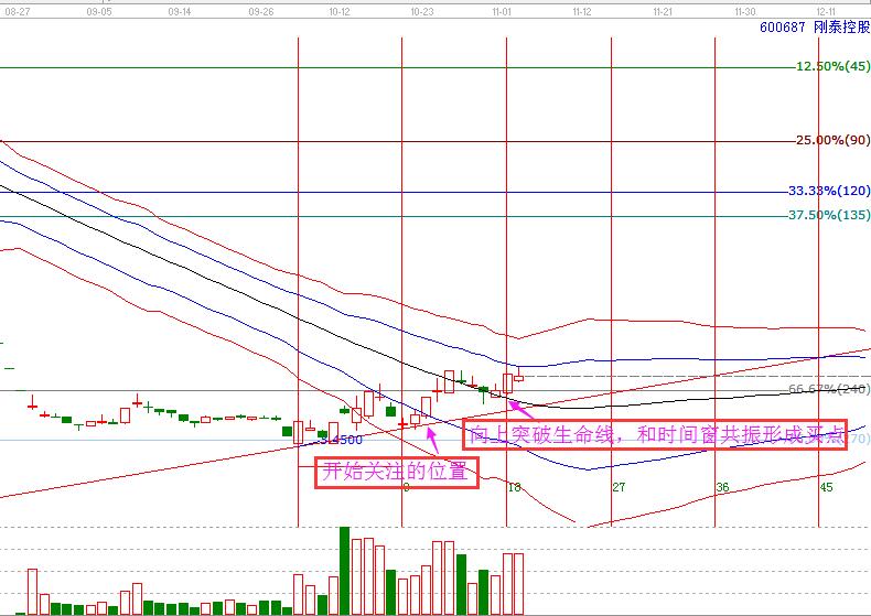 第二波:剛泰控股向上突破生命線位置,然后圍繞生命線震蕩,符合生命線最佳買點,再做時間周期分析,1號為等距時間變盤點,即將發(fā)生趨勢反轉(zhuǎn),時間和生命線共振,因此在31號贏家江恩群中做提示:1號時間窗,即將再次拉升。用戶在30號、31號、1號分別再次買進剛泰控股在1號收大陽線,2號再拉升,累計獲利15%左右。