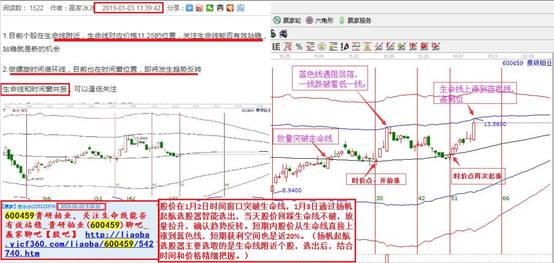 1月3日關(guān)注個(gè)股貴研鉑業(yè)(600459),同樣,股價(jià)在1月2日時(shí)間窗口突破生命線,1月3日通過(guò)揚(yáng)帆起航選股器智能選出,當(dāng)天股價(jià)回踩生命線不破,放量拉升,確認(rèn)趨勢(shì)反轉(zhuǎn)。短期內(nèi)股價(jià)從生命線直接上漲到藍(lán)色線,短期獲利空間也是近20%。(揚(yáng)帆起航選股器主要選取的是生命線附近個(gè)股,選出后,結(jié)合時(shí)間和價(jià)格精細(xì)把握。)