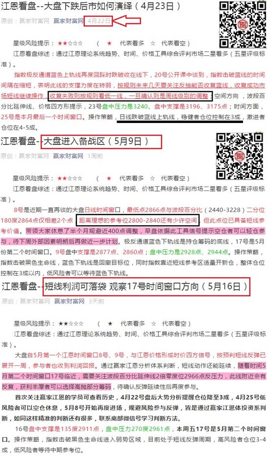 大盤五一節(jié)后的反彈,在5月17日時間窗口宣告結(jié)束。贏家江恩從4月22日盤中明確提示風(fēng)險(xiǎn),到等待5月8日-9日時間窗口備戰(zhàn)交易,并于2800-2840區(qū)間進(jìn)行短線抄底建倉,到5月17日2966點(diǎn)附近見頂回落。投資者再次經(jīng)歷了一次市場的完美漲跌,從0到360度完成一個漲跌循環(huán)。對于市場的判斷,贏家大勢分析都有展示,在此我們做下回顧。