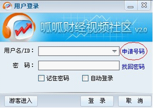 第三步:安裝好后桌面出現(xiàn)"呱呱財經(jīng)視頻社區(qū)",雙擊,點擊申請?zhí)柎a。申請?zhí)柎a,像QQ一樣,號碼申請完畢后記住號碼,然后登陸大廳
