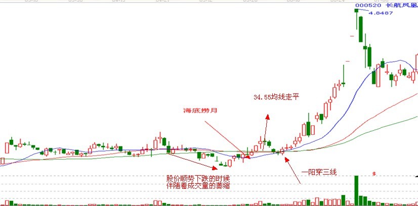 二:13日均線隨成交量的穩(wěn)步放大,股價穩(wěn)步攀升,13日線重新上穿55均線,這個過程就是海底撈月。
