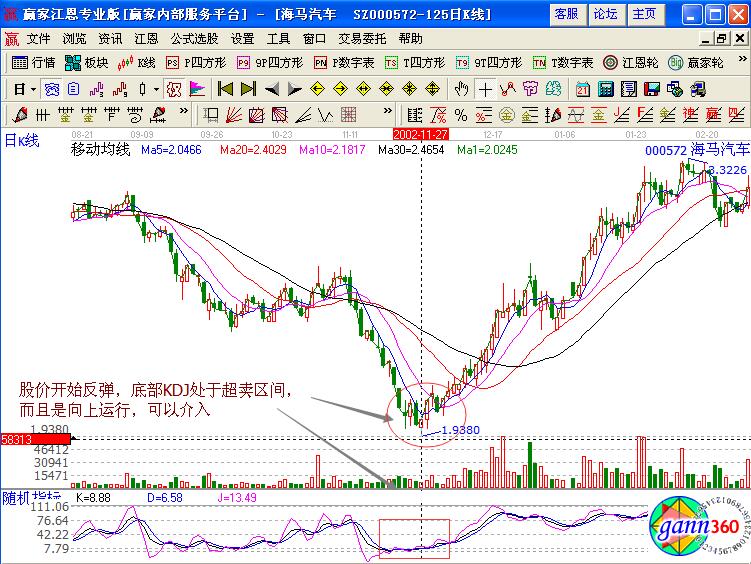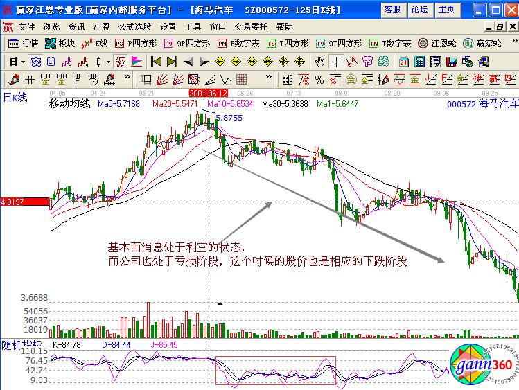 下面我們通過(guò)具體的實(shí)例進(jìn)行分析,海馬汽車(chē)是一只長(zhǎng)期處于弱勢(shì)運(yùn)行的股票,其基本面的消息是,公司地處海南,主營(yíng)業(yè)務(wù)是開(kāi)發(fā)區(qū)的綜合開(kāi)發(fā),建設(shè)以及管理,而該公司在2001年的是處于虧損的狀態(tài),相應(yīng)的股價(jià)也處于連續(xù)的下跌中,其中虧損的原因是依據(jù)國(guó)家的改革進(jìn)行各項(xiàng)資金回歸實(shí)際價(jià)值,化解資產(chǎn)虛增的潛在因素。