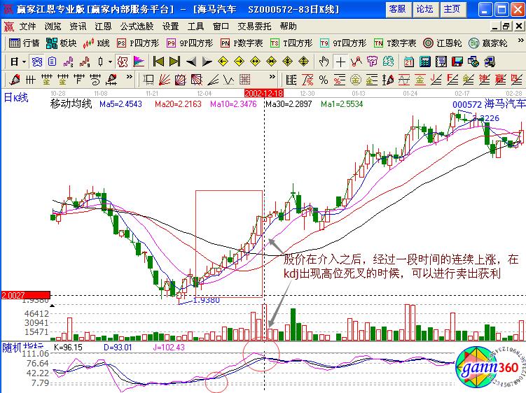 從中可以觀察到該股下跌的趨勢(shì)一直延續(xù)到2002年11月27日,而且當(dāng)天的最低價(jià)是在4.20元的位置,股價(jià)在當(dāng)天出現(xiàn)了小陽(yáng)線的走勢(shì),在12月5日的時(shí)候,對(duì)應(yīng)的KDJ指標(biāo)日線走勢(shì)觸及頂部并且有鈍化的跡象出現(xiàn),所以股價(jià)出現(xiàn)了上下震蕩的走勢(shì),而且當(dāng)天股價(jià)的最高價(jià)與最低價(jià)相差有4.82-4.63=0.19元,這個(gè)時(shí)候很多的短線投資者都會(huì)拋出離場(chǎng)。
