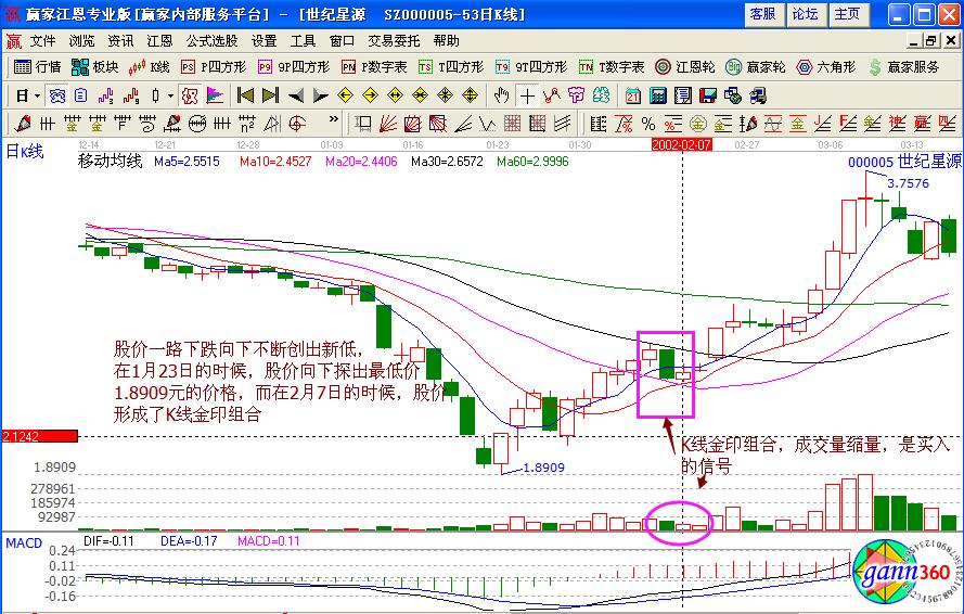 在股價(jià)探底回升的時(shí)候,5日均線由下向上上穿10日均線,股價(jià)在10日均線上方形成縮量的金印組合,就可以構(gòu)成買入的信號(hào)。具體的實(shí)例如圖世紀(jì)星源(000005)在2001年到2002年的股價(jià)走勢(shì)變化,在2001年底的時(shí)候股價(jià)一路下跌,在2002年1月23日的時(shí)候,股下探到3.12元后展開強(qiáng)勢(shì)的反彈操作,之后依據(jù)均線系統(tǒng)的走勢(shì),5日均線在股價(jià)反彈中迅速掉頭向上,在1月30日的時(shí)候上穿10日均線,在2月7日的時(shí)候形成了縮量的金印組合形態(tài),是買入的操作信號(hào),投資者可以積極的進(jìn)行買入操作。