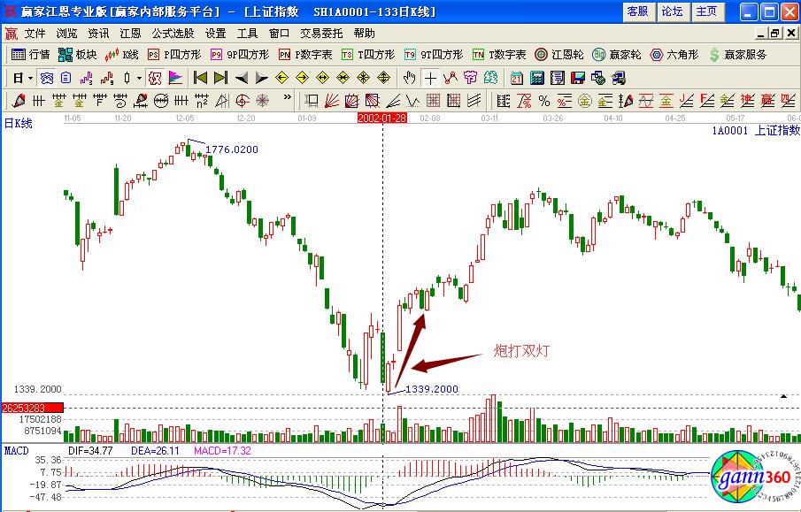 具體的實(shí)戰(zhàn)操作案例如圖上證指數(shù)在2002年1月底的股價(jià)走勢,前期經(jīng)過一波深度的下跌走勢,在1月28日前后形成了炮打雙燈戰(zhàn)法的兩陽加一陰的走勢形態(tài),而且此時(shí)的量能是比較充足的,說明指數(shù)價(jià)格將要止跌企穩(wěn),投資者可以繼續(xù)關(guān)注后期的走勢變化。