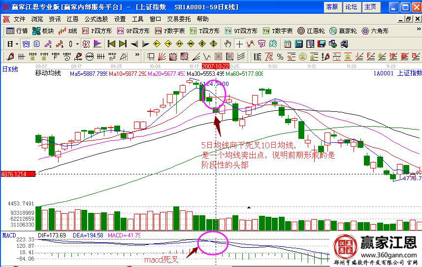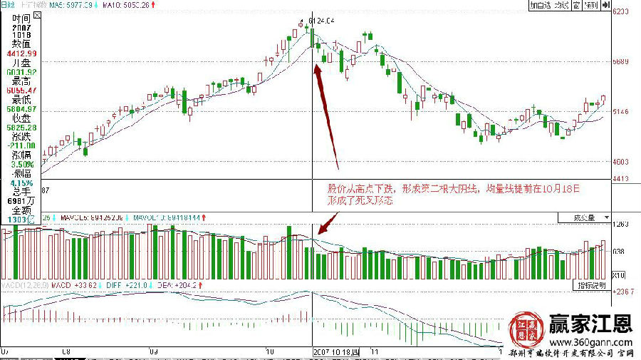 如圖上證指數(shù)在2007年10月份的走勢(shì)變化,指數(shù)經(jīng)過上漲拉升到達(dá)6124.04的高點(diǎn)之后,開始下跌回落,此時(shí)5日均線下穿10日均線形成了高位的一個(gè)死叉,是賣出的信號(hào),說明前期的走勢(shì)已經(jīng)形成了一個(gè)階段的高點(diǎn);