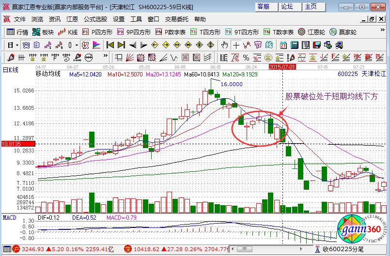 6、若股票出現(xiàn)破位走勢(shì)情況應(yīng)及時(shí)賣出,如下圖,股票的破位是走勢(shì)處于所有均線的下方,是股價(jià)在下跌過(guò)程中遇到反彈升高后又下跌至最低的情況,此時(shí)的走勢(shì)呈現(xiàn)死叉,一種弱勢(shì)運(yùn)行,為避免損失更多應(yīng)及時(shí)賣出。